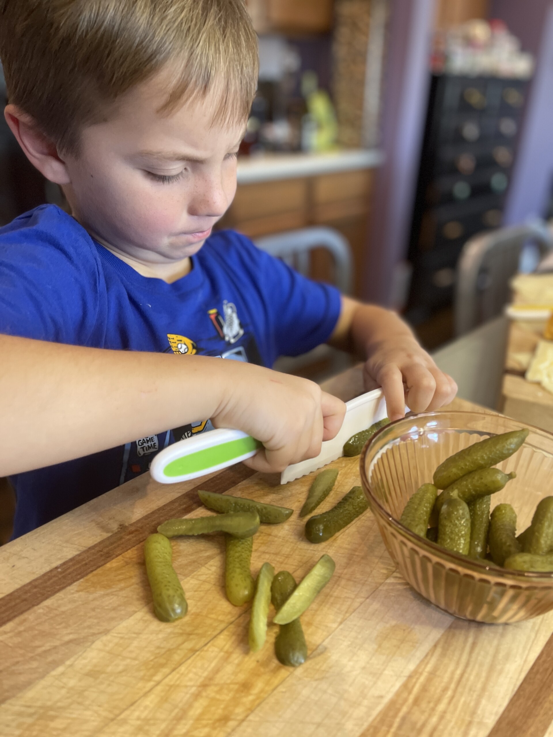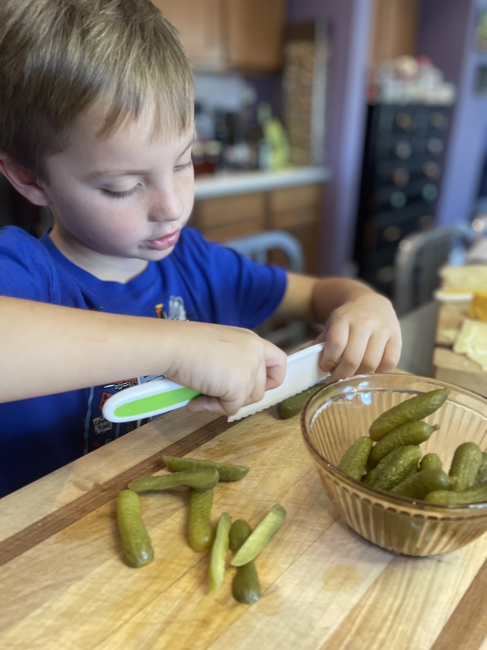 “Taste First” has always been my philosophy when I cook with adults, and it applies to kids, too. Luke and I tasted four different cheeses and then moved on to pickles. This is a great way for kids to try new foods and have a choice.