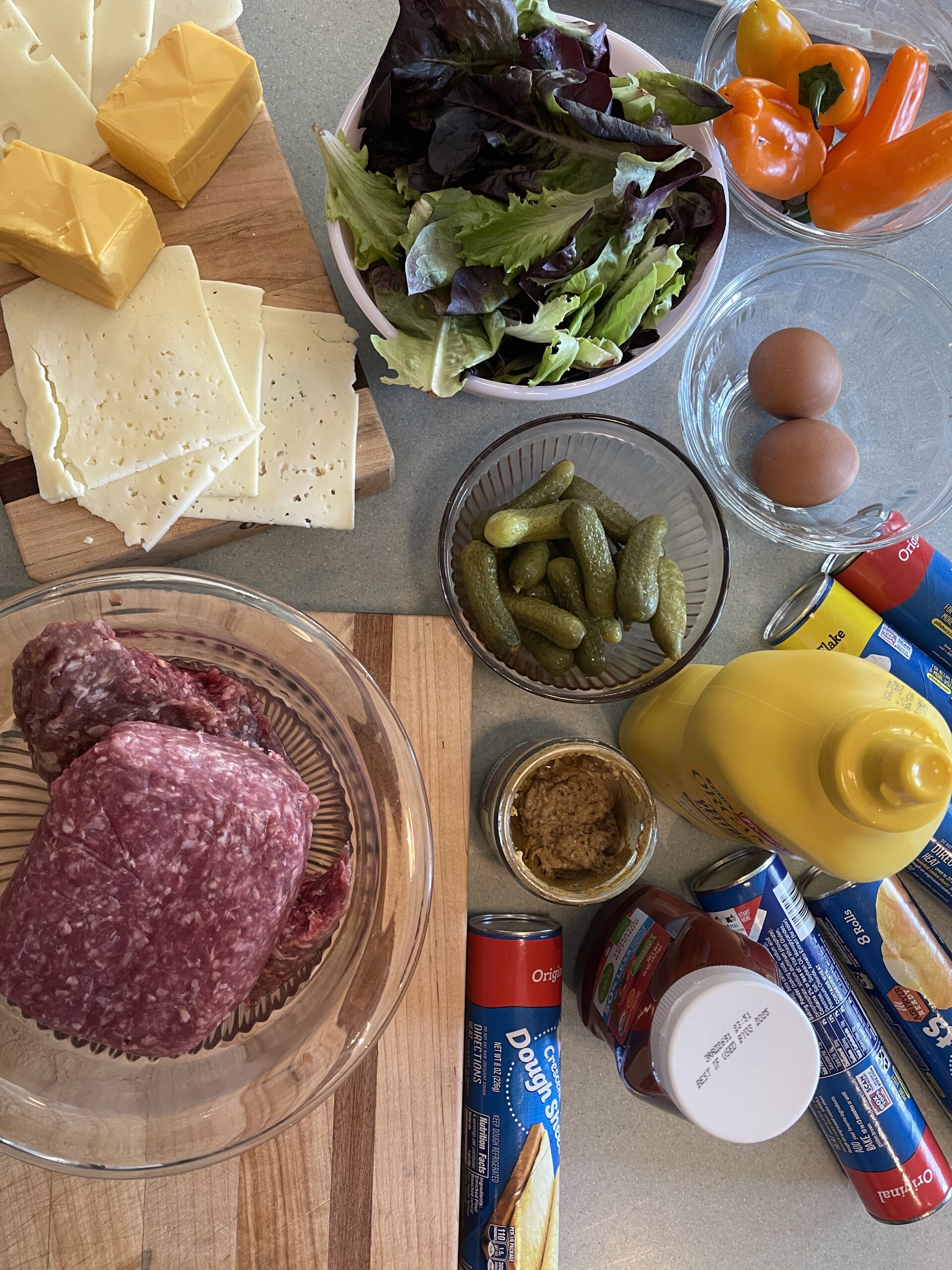 Because we used ground beef, our Mystery Sandwiches resembled hamburgers, so our buffet of add-ins included cheese, sliced sweet peppers, pickles, ketchup, mustard, lettuce, fresh spinach, and salt and pepper. And, because I like adding in a fun surprise ingredient, we had baked tater tots as well.