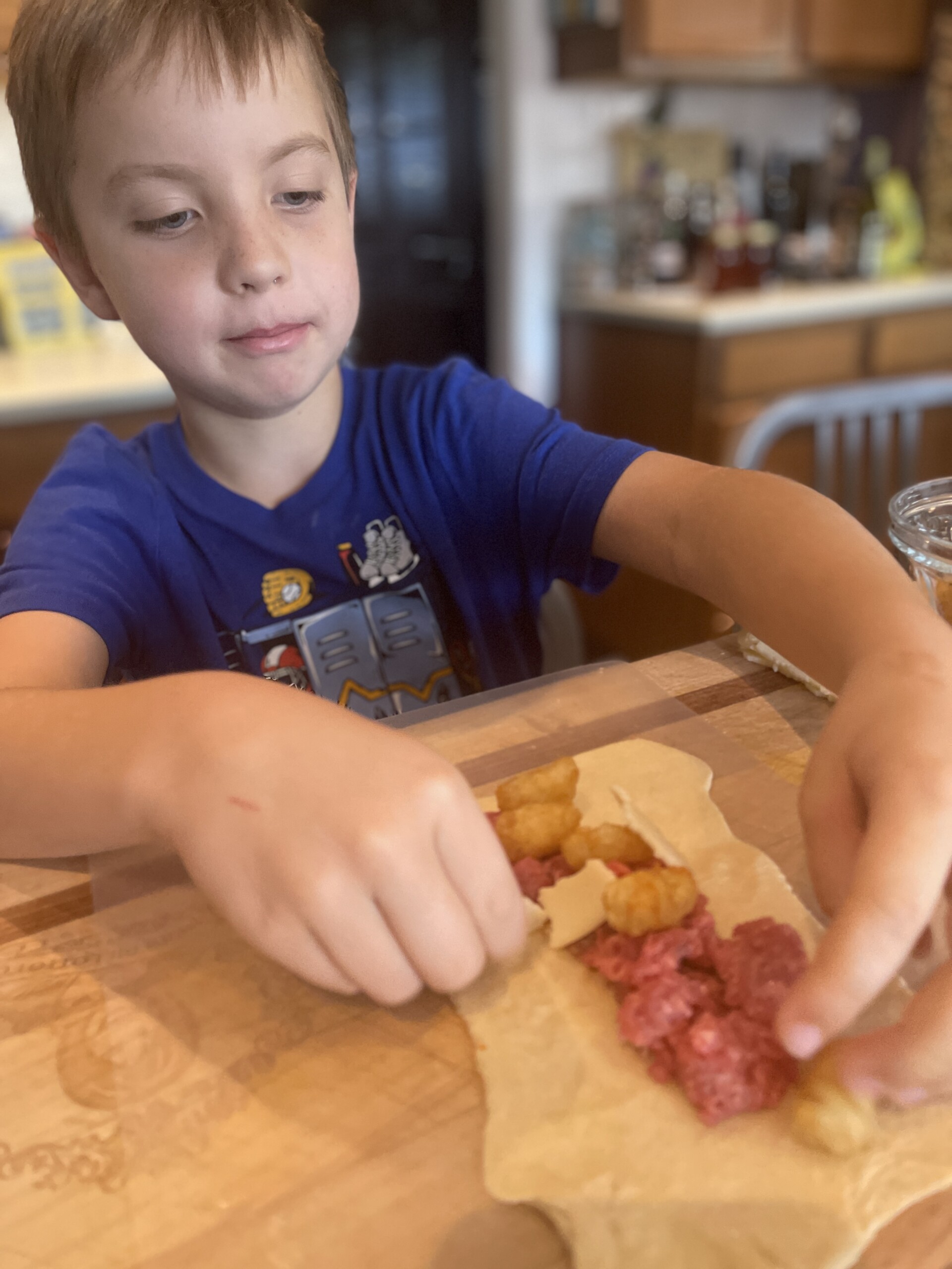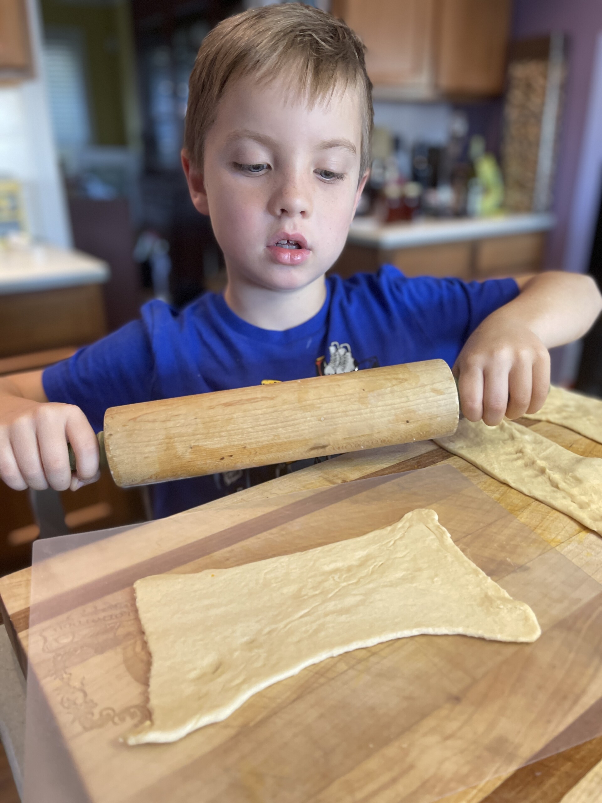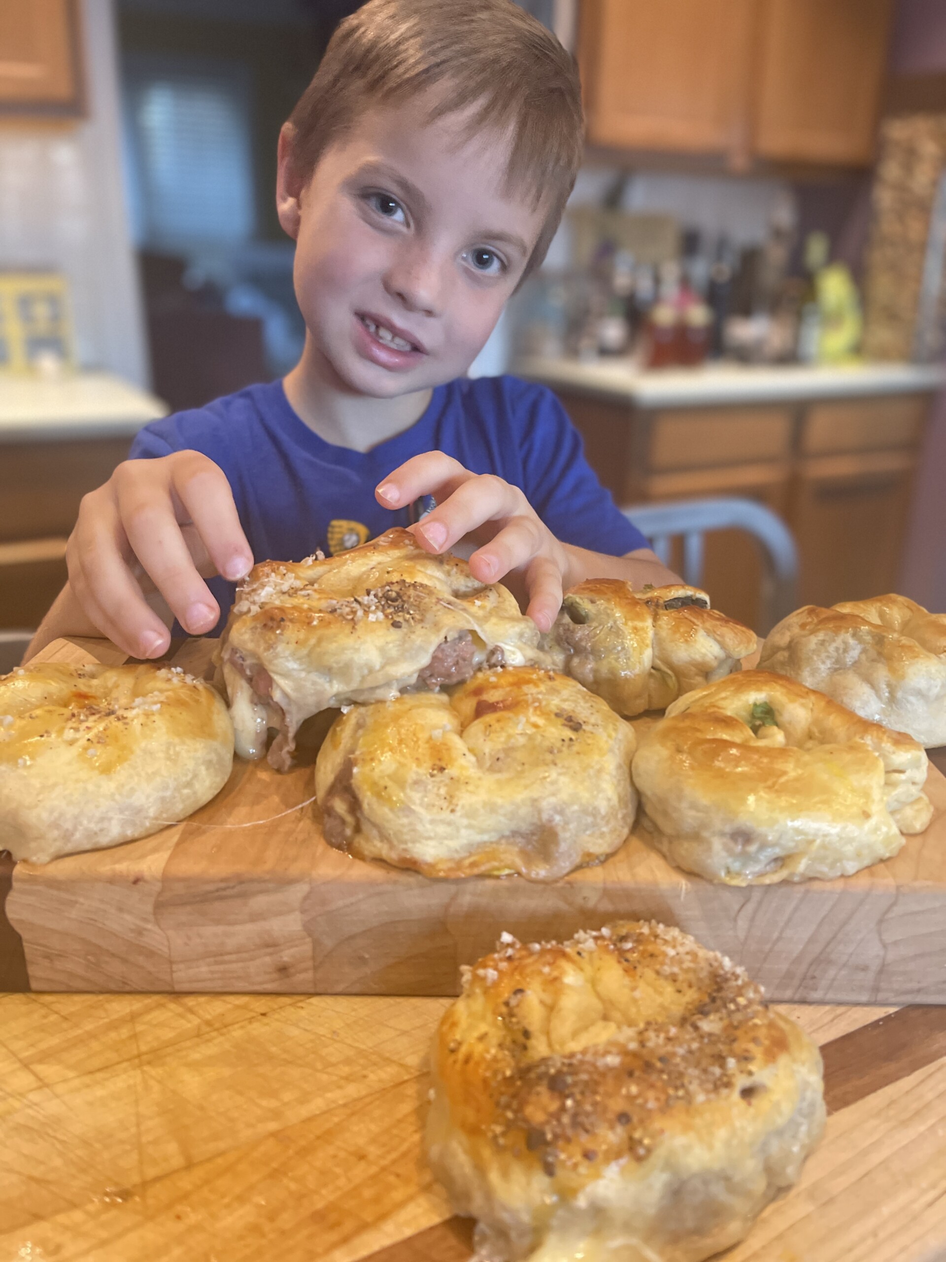 This month I’m cooking with my 8-year-old neighbor, Luke Tolley, and we’ve prepared what Luke calls “Mystery Baked Sandwiches.” This is a fun one, and it’s super simple. So simple, in fact, there’s not really a formal recipe. All you need to do is to follow the process.
