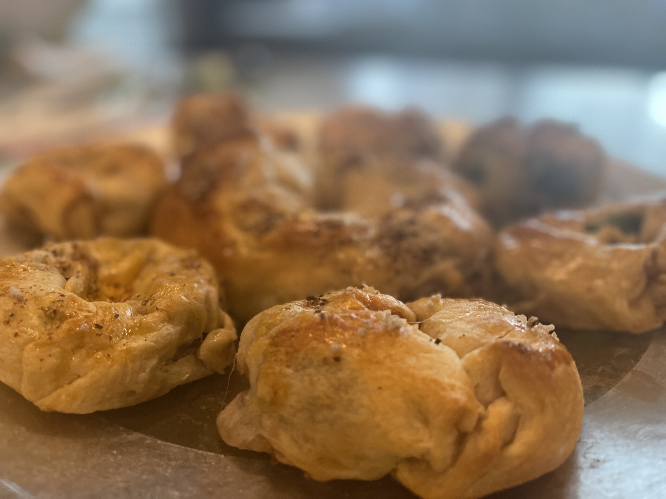 7. Place the bagel-shaped dough rounds on a parchment paper or a foil-lined baking sheet. Brush the top of each with a little bit of beaten egg and bake in a preheated 375-degree oven for 9-12 minutes.